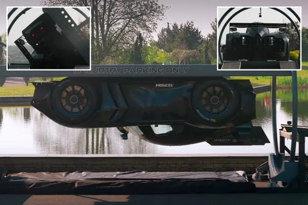 Thomas Yates, co-founder of McMurtry Speirling Automotive, performed the demonstration on a customized platform. He started the vehicle on the platform, activated the fan system, and rotated the platform 180 degrees. During the rotation, the vehicle stayed in place without any mechanical support. After fully inverting the platform, Yates drove the vehicle a short distance and then drove off once the platform returned to its original position.