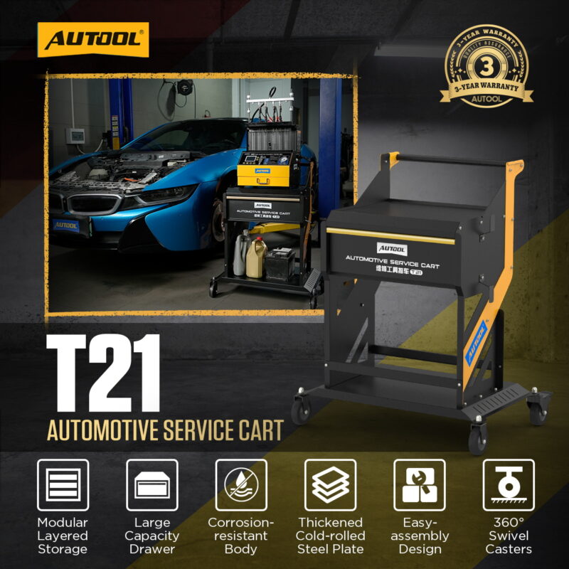 The AUTOOL T21 Mobile Maintenance Cart is made of strong cold-rolled steel. It has wide shelves and a drawer for tool storage. The top shelf fits AUTOOL brake fluid exchangers. It moves easily and is simple to use. This cart is a great helper for keeping tools organized in any workshop.