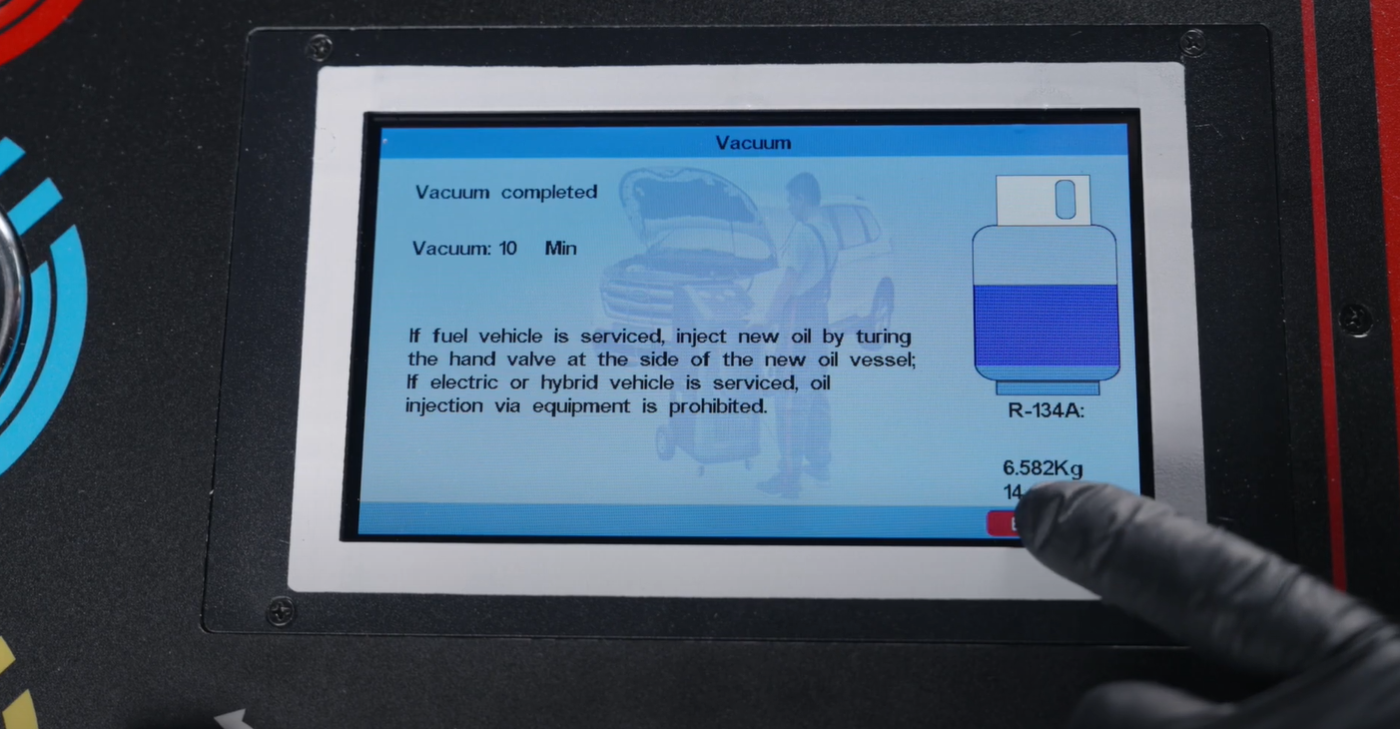 - Vacuuming: The AUTOOL LM708 Freon Recovery Machine unit removes air and moisture from the air conditioning system. Once evacuation is complete, the system prompts you to manually fill with oil.