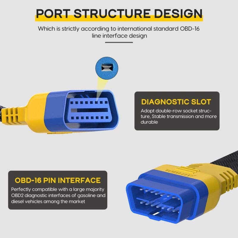For AUTOOL OBD enhanced cable series, we apply full-automatic technology, use high quality pure copper core and plastic with TPE materials also covered with Protecting Nylon Braided Sleeves. It takes 8 inspection steps from injection to molding to ensure the cable can be plugged over 10,000 times.
