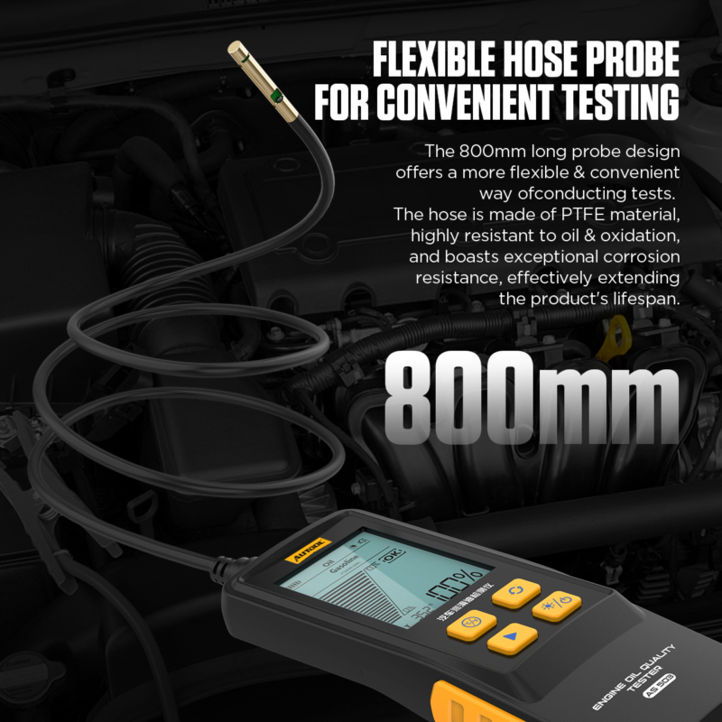 - Hose probe design: The 800mm long probe design offers a more flexible and convenient way of conducting tests. The hose’s PTFE material resists oil and oxidation, and its exceptional corrosion resistance effectively extends the product’s lifespan.