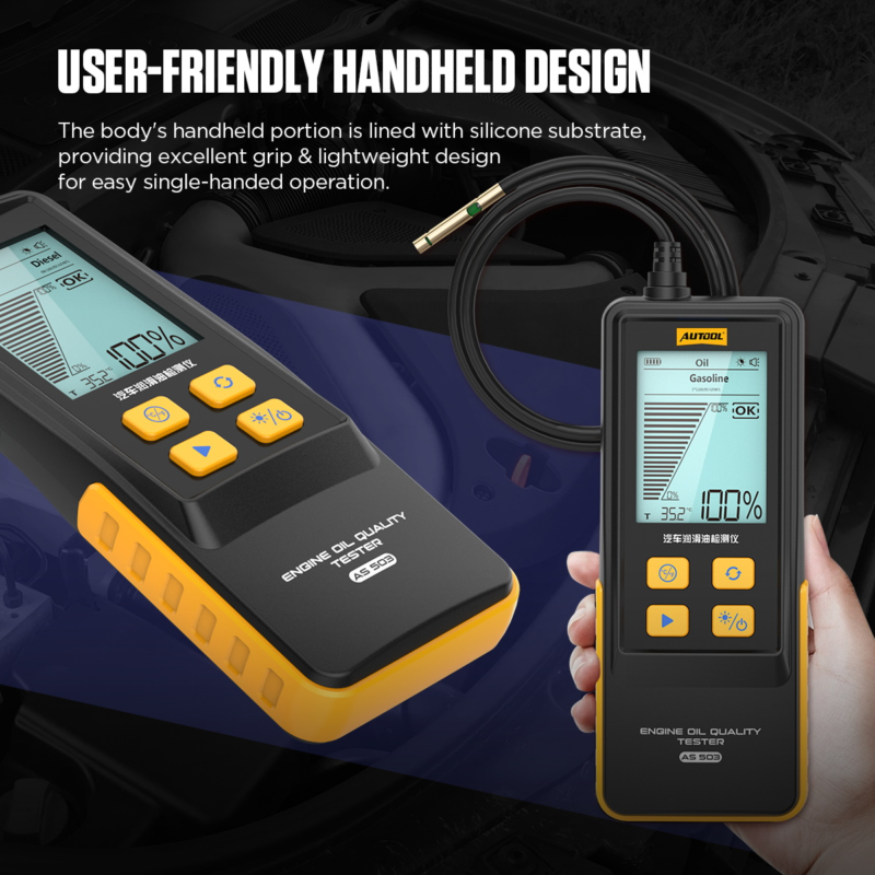 This AUTOOL AS503 engine oil tester is really useful! It only takes a few seconds to determine if the oil should be replaced, no more feeling or blindly changing the oil, saving money and the environment. It's very easy to operate, plug in the power, plug in the probe, and the readings are clear at a glance, making it suitable for individual car owners as well as maintenance stores.
