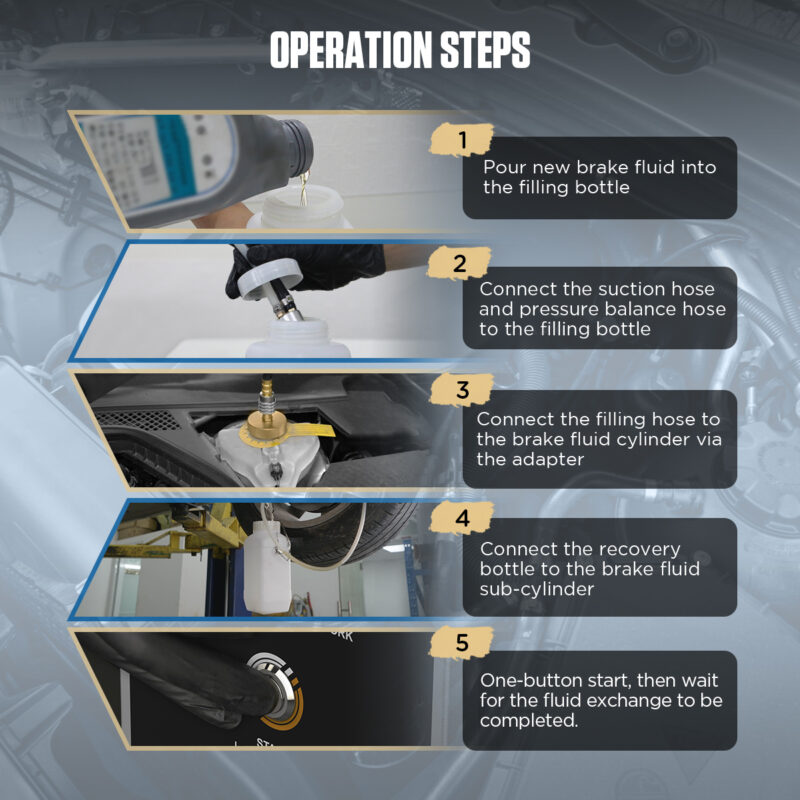 - Step 7: After completing the replacement, first tighten the screw on the wheel cylinder/brake caliper, then turn off the machine. This step is very important. Many customers have reported air entering the system because of the incorrect shutdown sequence.