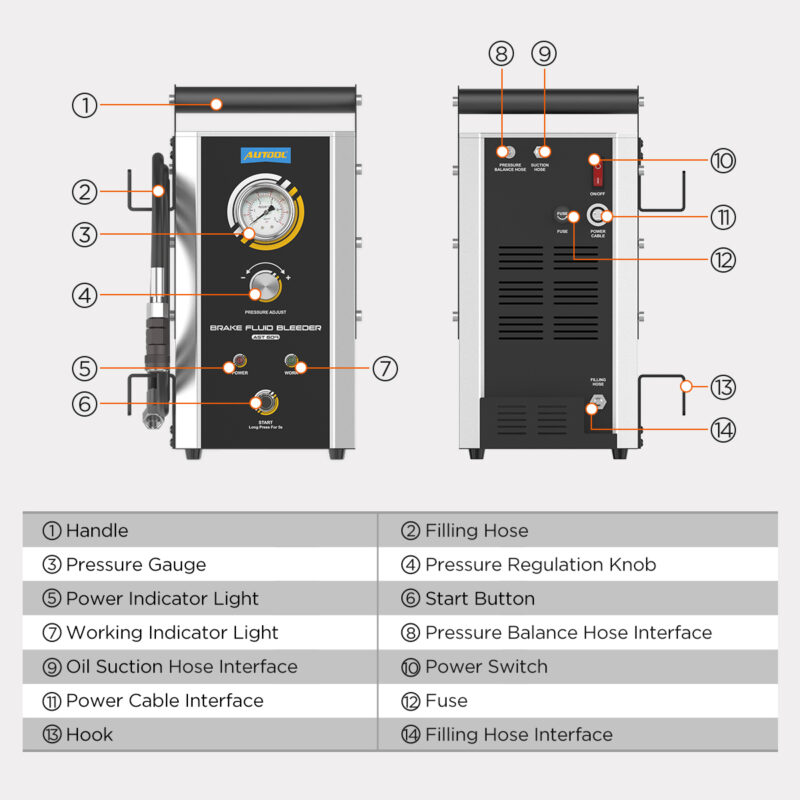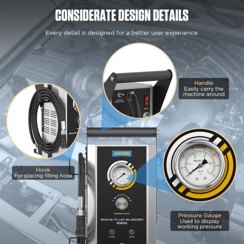 - Portable Design: AUTOOL AST609 brake fluid bleeder kit design very compact, with handle, easy to carry. There is a hook on the side of the AST609 for placing the filling hose. There is a pressure gauge on the front, you can see the working pressure at any time. The back of the product has a spot for a 1L corrosion-resistant filling bottle for new brake fluid.