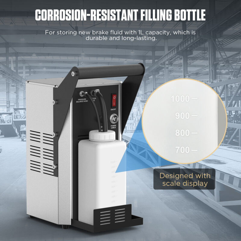 - Built-in Pressure Monitoring System: The pump for filling the brake fluid reservoir has a built-in pressure monitoring device. You can adjust the pressure with an adjustable knob, ranging from 0.6 to 3.0 BAR. If the pressure cannot be established or if the pump sucks in air, it will shut down automatically. You can also place the recycling bottle in the machine body for easy transport.