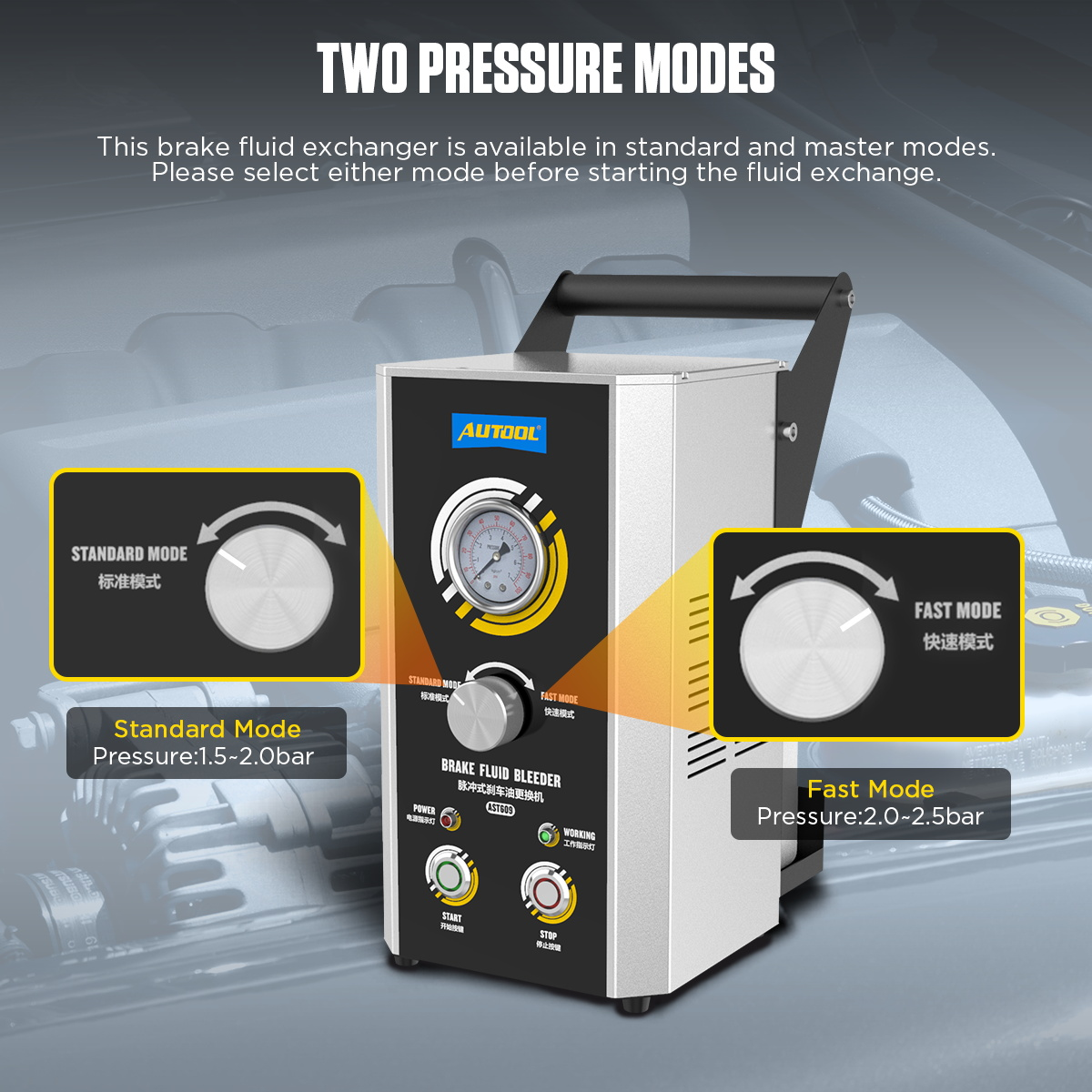 - Dual Pressure Mode: AST609 brake fluid bleeder kit has dual pressure mode, standard mode 1.5-2.0 bar (5 minutes); Master mode 2.0-2.5 bar (3 minute). You can adjust the pressure through the adjustable knob, please select the specific mode before starting the fluid exchange.