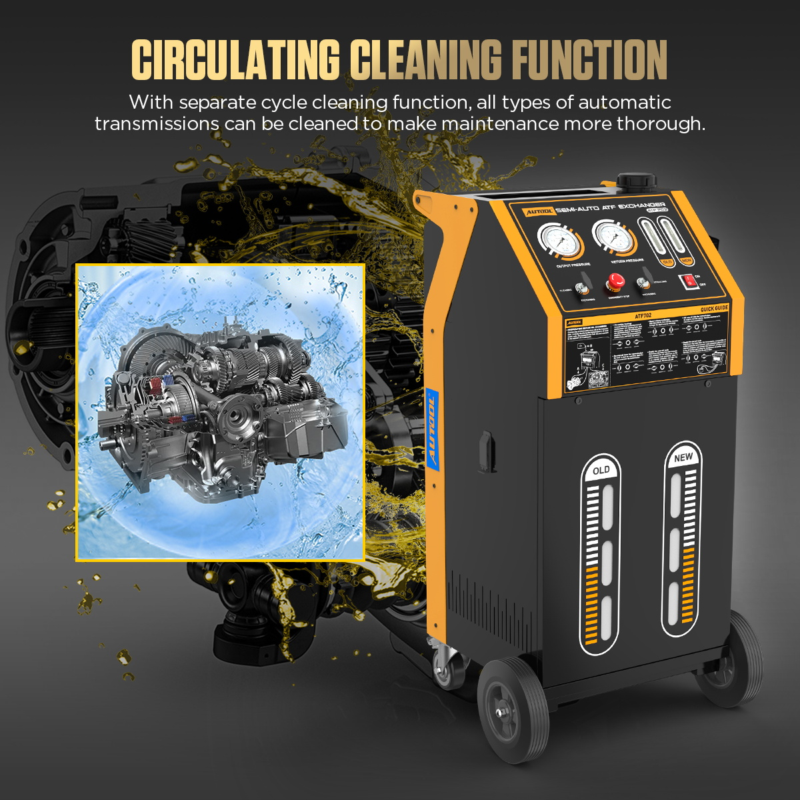 AUTOOL ATF702 Transmission Fluid Exchanger can complete the cleaning and oil change of the gearbox, hydraulic torque converter, and related components in just 20 minutes, achieving nearly 100% efficiency. Metal chips and oil sludge inside the gearbox can be removed completely without disassembly. The adjustable pressure design allows for customization according to different vehicle models, and the separate cycle cleaning function ensures thorough maintenance.
