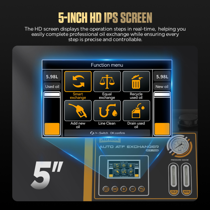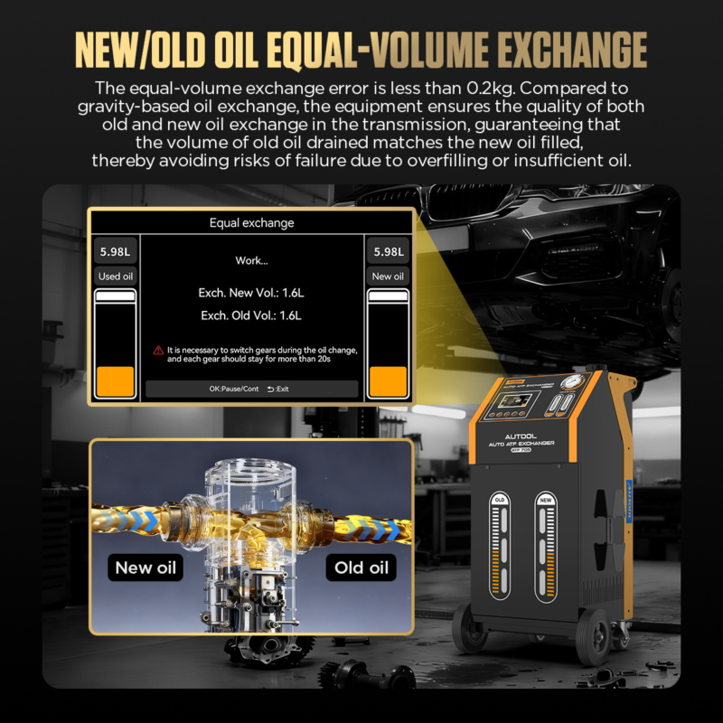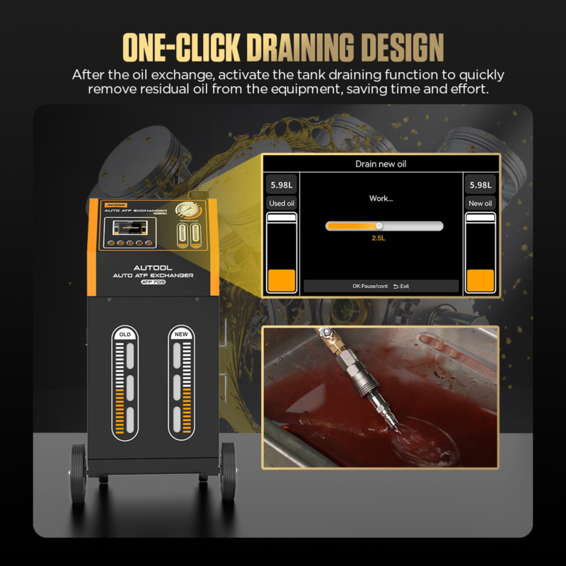 • Automatic: Fully automated program control for high-precision, equal quantity exchange between new and old fluid. Effectively solves the problem of incomplete manual replacement of transmission fluid.