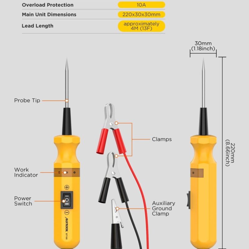The AUTOOL BT160 Car Circuit Tester reduces diagnostic time in automotive electrical systems. Simply connect it to the vehicle’s battery, and the technician can test positive or negative battery current by adjusting the switch. It features short circuit protection and can instantly check for bad ground contacts, helping locate and track short circuits efficiently.