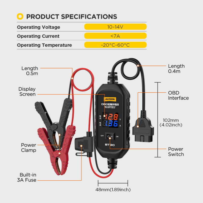 AUTOOL BT30 ECU Emergency Power Supply Cable is equipped with a high-definition digital display, which makes it easy to observe the voltage and current changes during the operation of the device. It is also equipped with an insulated cable to prevent electrical leakage and a fully enclosed design for a more comfortable touch. A built-in 3A fuse prevents damage to the unit and vehicle ECU in the event of a circuit failure.