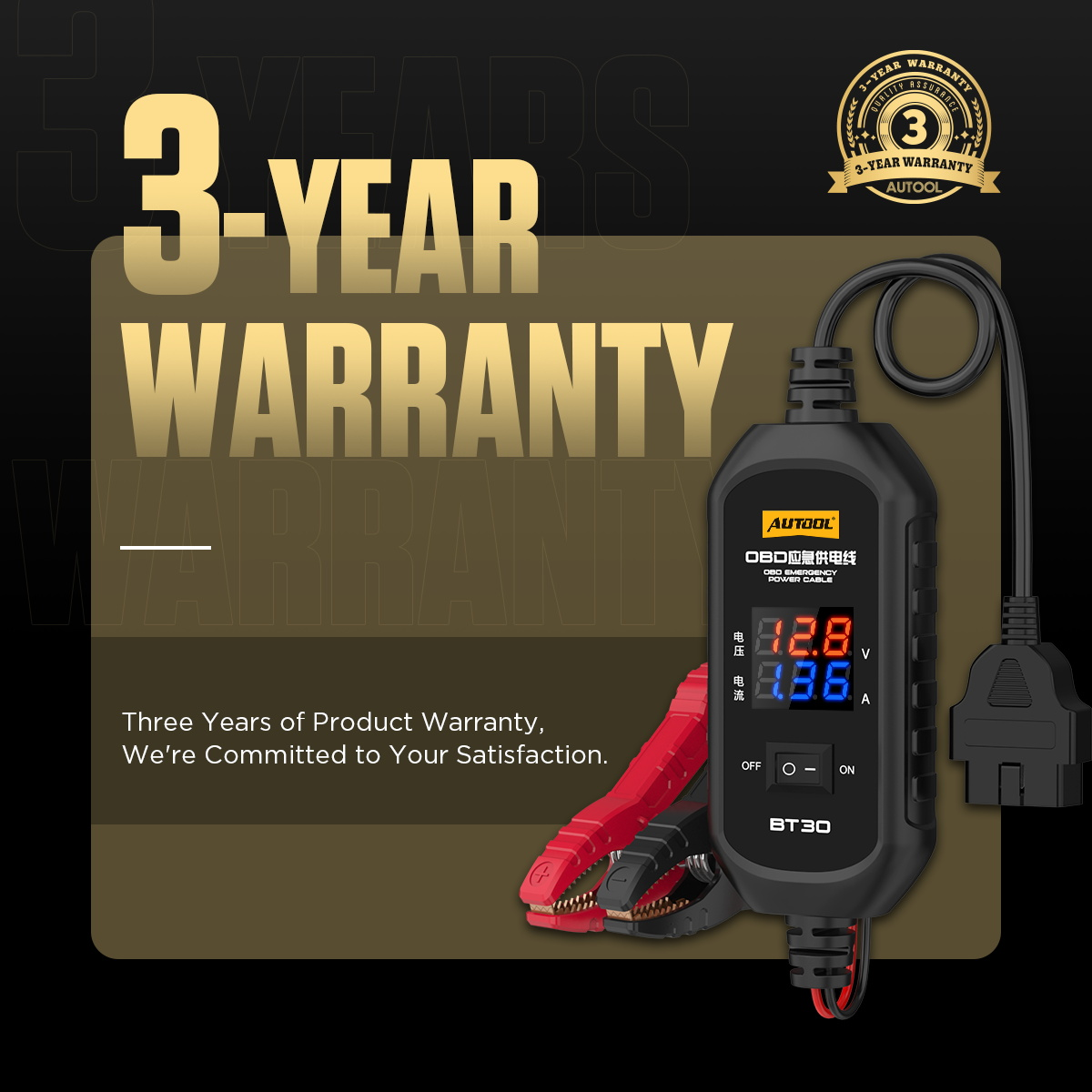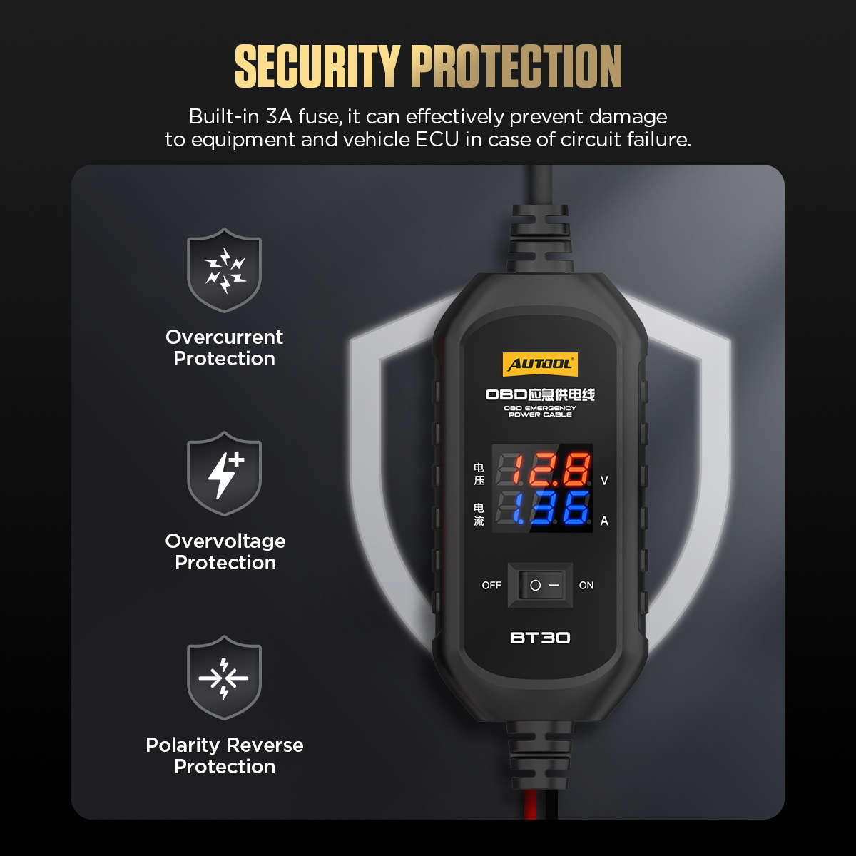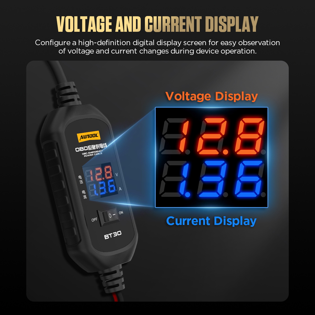 AUTOOL BT30 ECU Emergency Power Supply Cable is equipped with a high-definition digital display, which makes it easy to observe the voltage and current changes during the operation of the device. It is also equipped with an insulated cable to prevent electrical leakage and a fully enclosed design for a more comfortable touch. A built-in 3A fuse prevents damage to the unit and vehicle ECU in the event of a circuit failure.