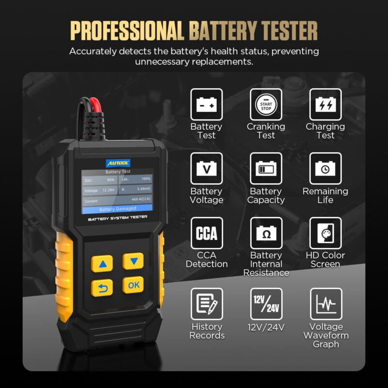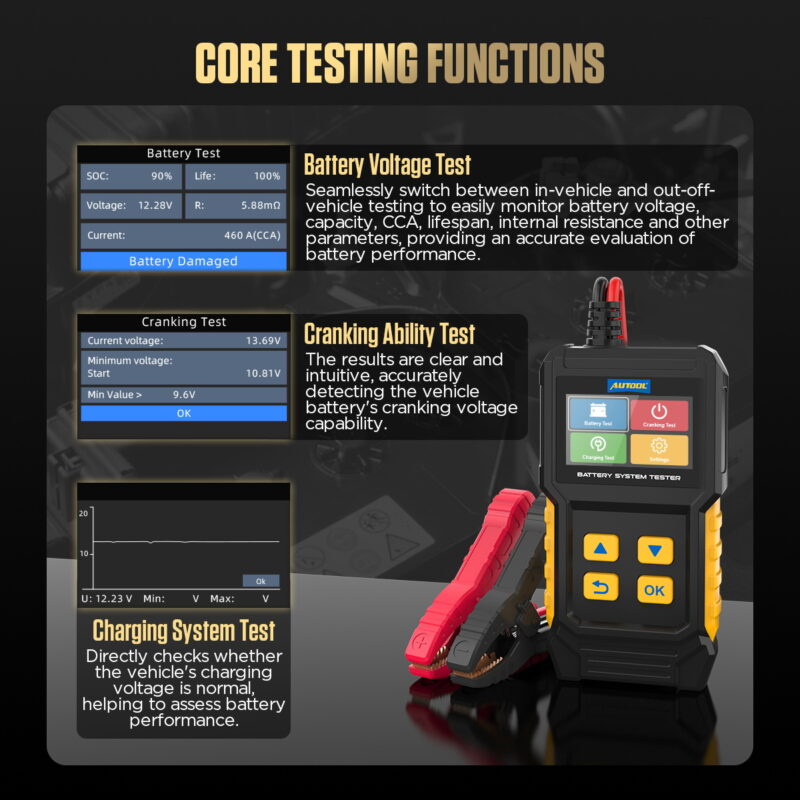 - Multi-Functions: AUTOOL BT360 Battery Tester includes Battery test, Cranking test, and Charging test functions. Mainly targeted to analyze the battery health status. It directly detects whether the battery is good or bad, and presents suggested solutions.