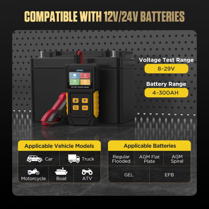 AUTOOL BT360 Car Battery Load Tester is dedicatedly developed to test 12V regular flooded, automotive lead-acid batteries, AGM flat plate, AGM spiral, GEL, and EFB batteries. It provides techs or DTYers with a quick, simple, and cost-effective solution to know the battery’s charging status better, check the battery’s health, and detect faults.