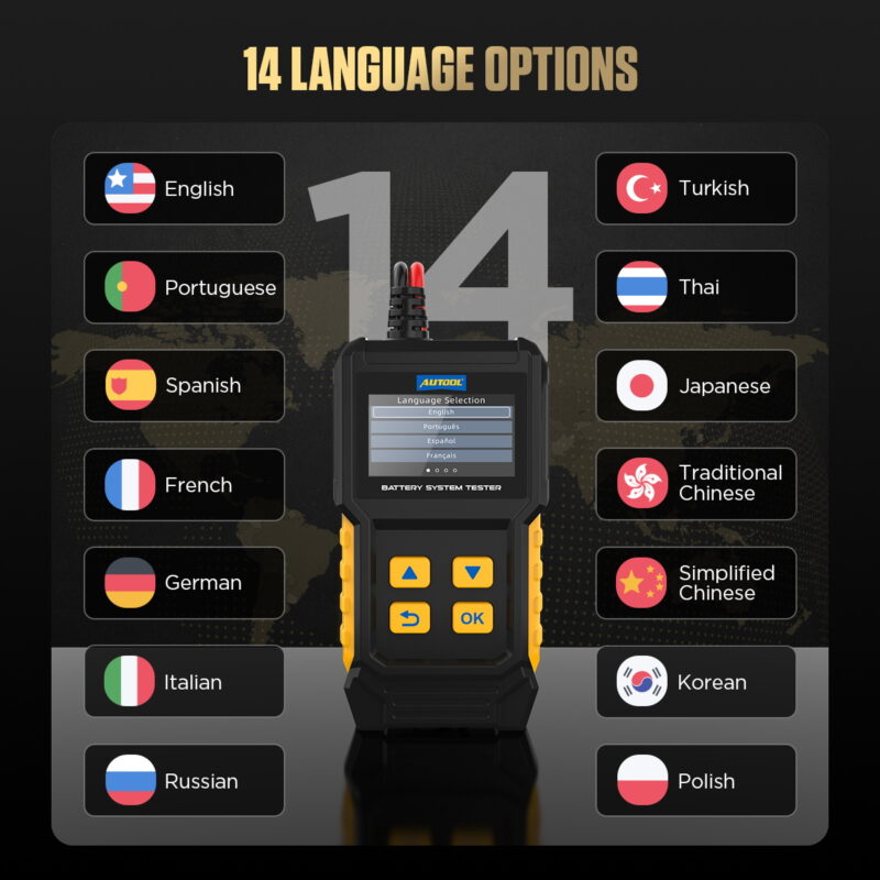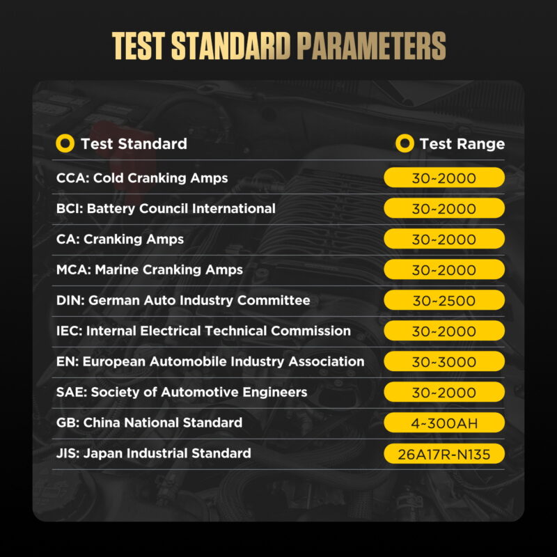 - Professional & Reliable: Test standards include most battery standards in the world, CCA, BCI, CA, MCA, JIS, DIN, IEC, EN, SAE, and GB, which covers from 20- 2000 CCA, 30-100 AH.