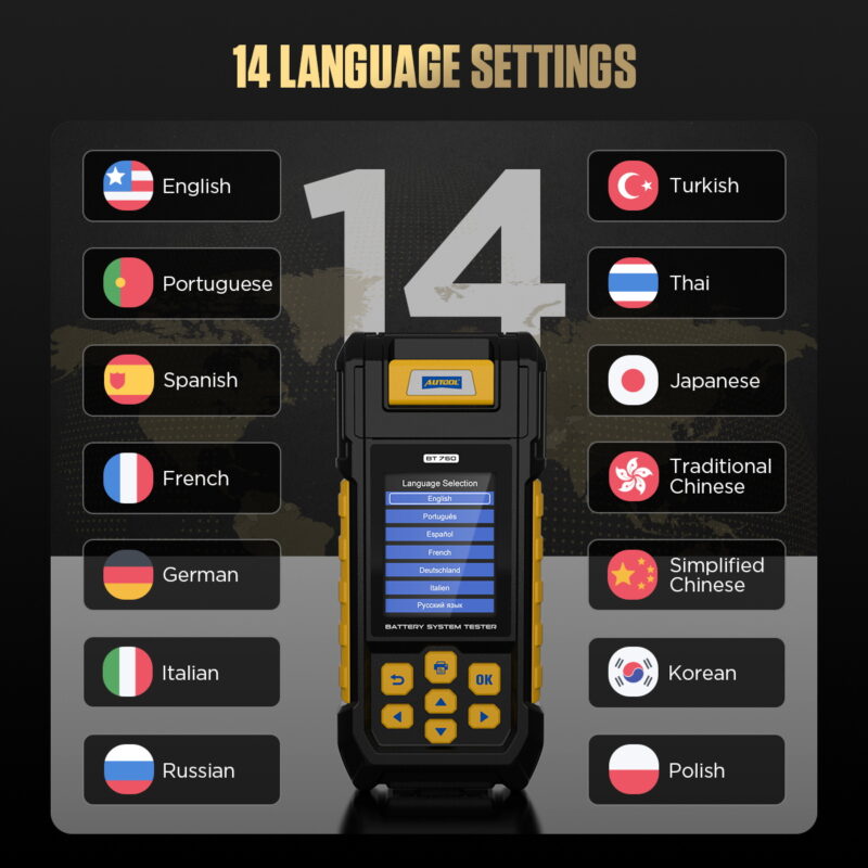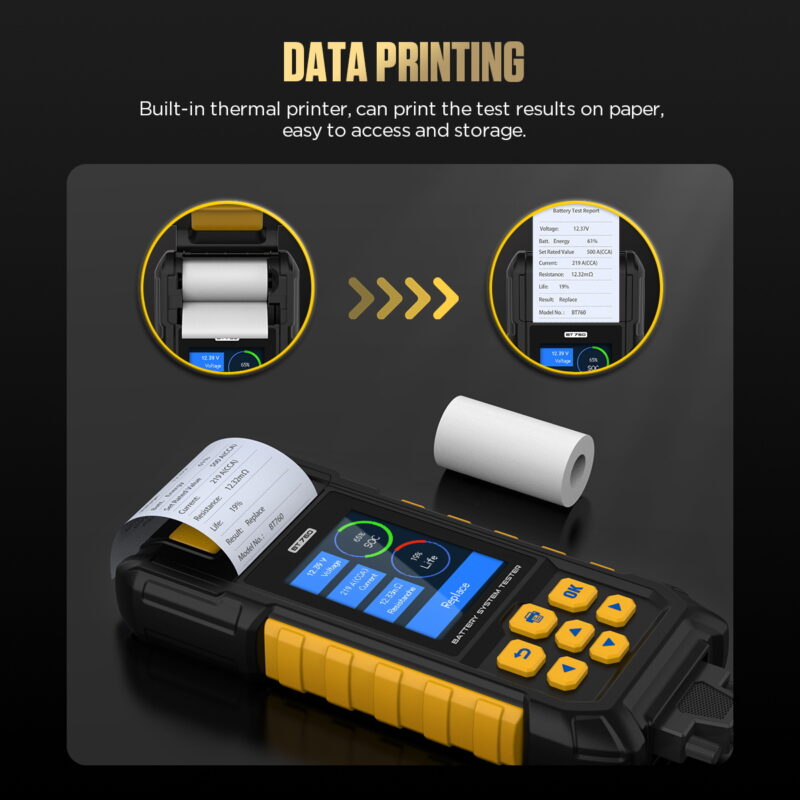 I am a novice car repair owner, and the Autool BT760 product meets my expectations very well. It has a built-in printing function, and the results can be printed directly after the test. It is convenient and fast. The clip line can be directly clamped on the positive and negative poles of the battery to select the content you want to test. It is suitable for novices to use