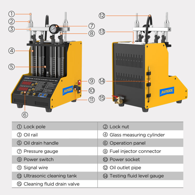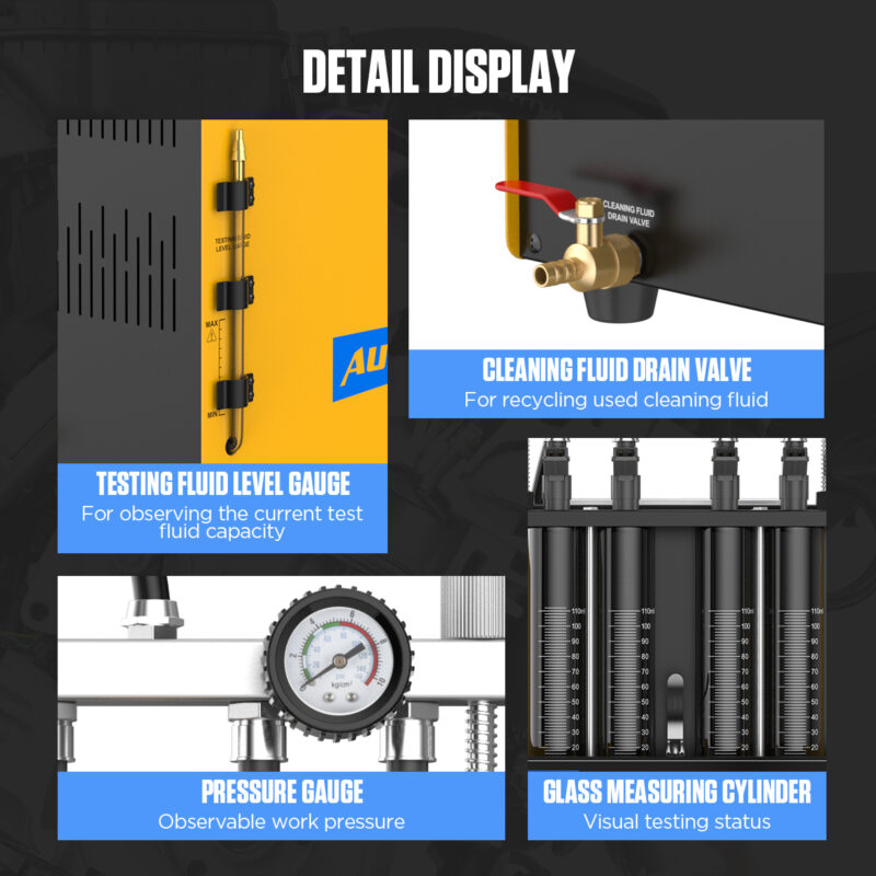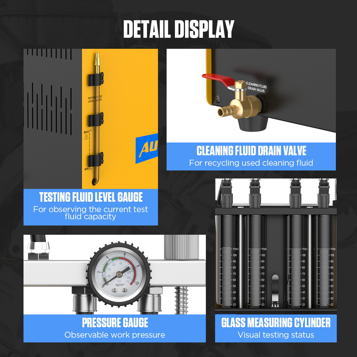 - Please use professional injector test fluid, as corrosive cleaning fluid will damage the equipment. If you damage the equipment by using cleaning fluid while testing the injector, you will be responsible for the repair costs.