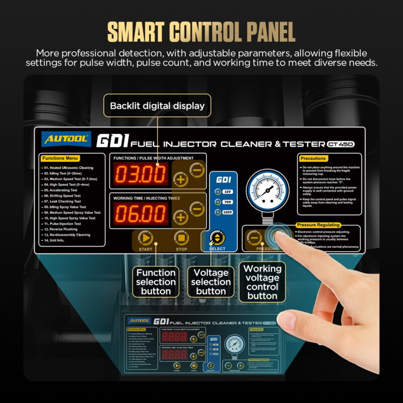 - Comprehensive Functionality: The AUTOOL CT450 Injector Cleaner offers 3 cleaning modes and 10 test functions for efficient cleaning and thorough diagnostics to ensure optimal performance of automotive injectors.