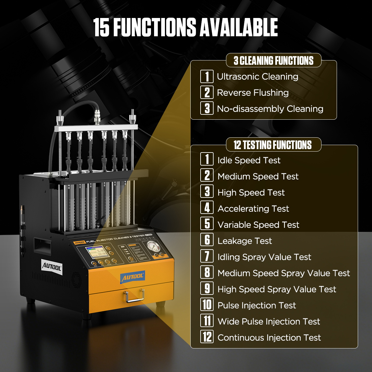 Although the AUTOOL injector cleaning tester can clean diesel injectors, it does not support testing them.