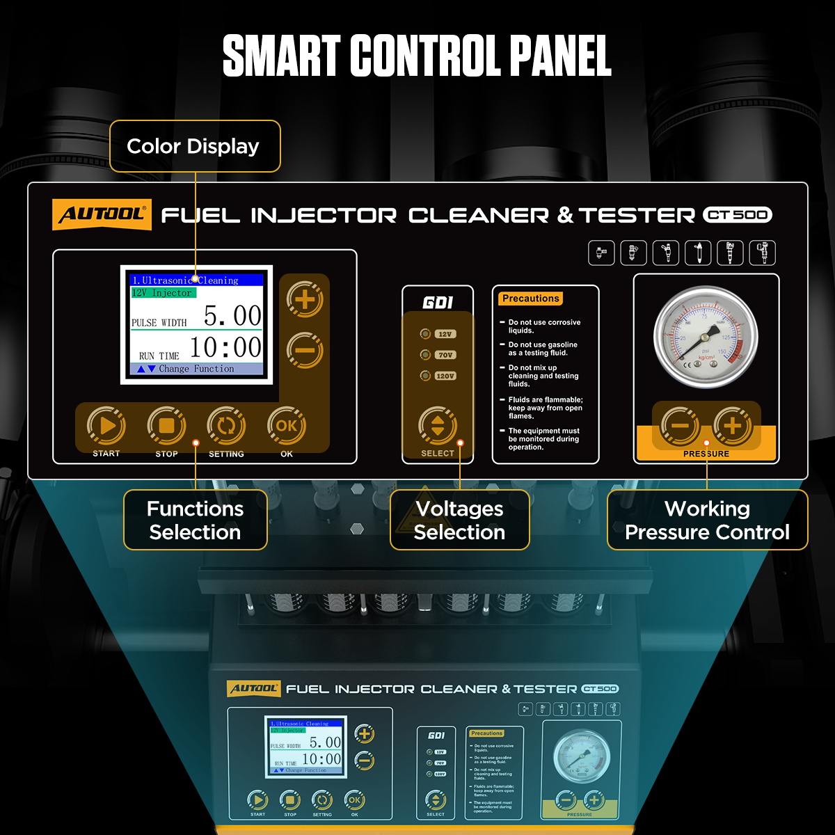 - Furthermore, the CT500 Fuel Injector Test Tool is equipped with an integrated GDI injector driving system that supports the cleaning and testing of various injector types, including GDI, EFI, FSI, and standard injectors. In addition, the equipment offers three voltage driving modes (12V, 70V, 120V) to meet the diverse needs of fuel injectors from mainstream automotive brands in Europe, America, and Asia, thereby showcasing excellent compatibility and performance advantages.