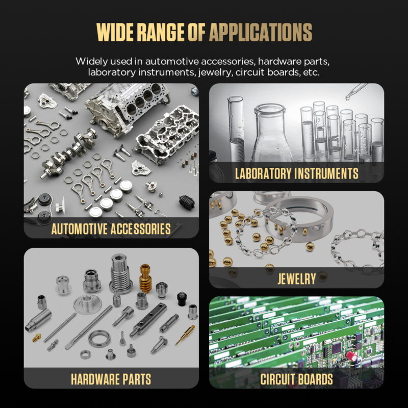 - Wide Application Range: It is suitable for various applications including automotive parts, hardware components, laboratory instruments, jewelry, circuit boards, and more.