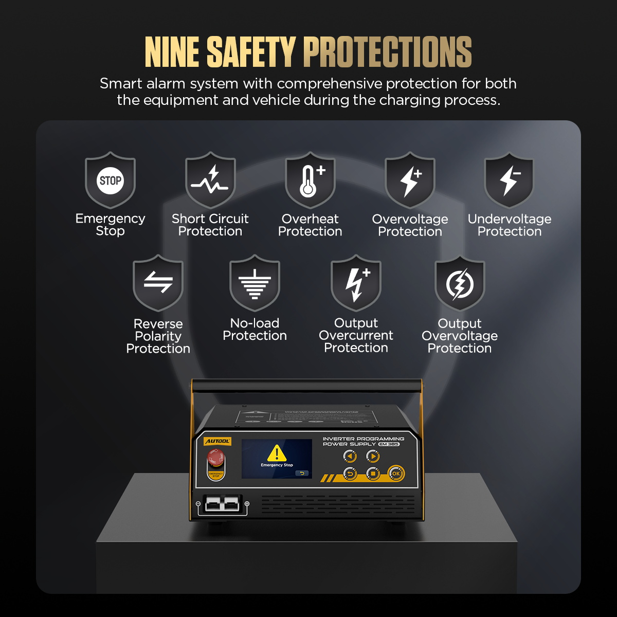 - Nine Safety Protections: Intelligent alarm prompts to fully protect the safety of equipment and vehicles during the charging process.
