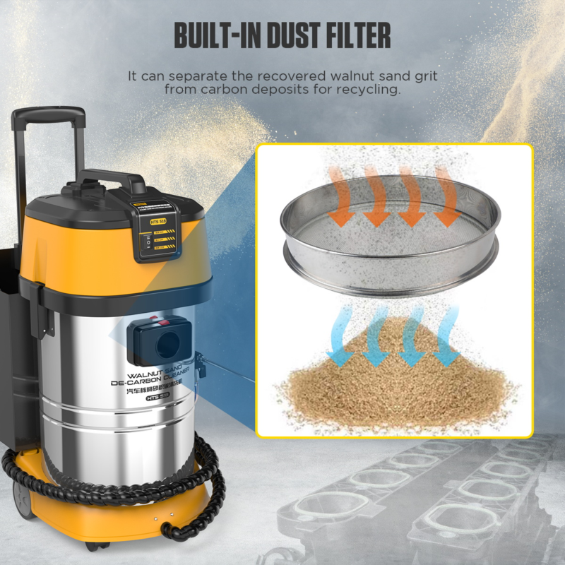- Built-in Dust Filter: It can separate the recovered walnut sand grit from carbon deposits for recycling.