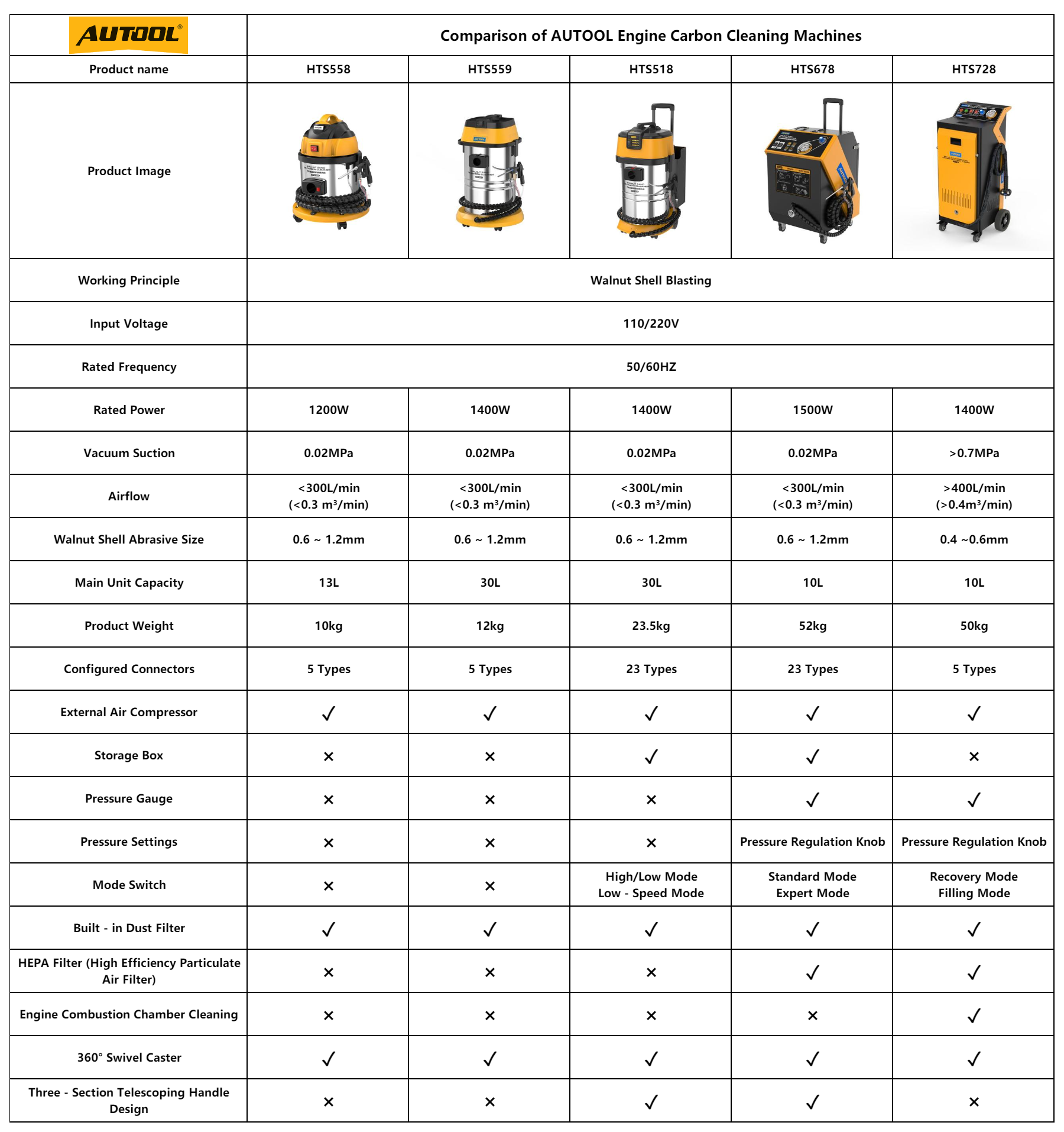 In contrast, the AUTOOL HTS728 Walnut Shell Sand Blaster is an upgraded version of the HTS678. This model utilizes finer walnut shell abrasive (0.4–0.6mm), making it ideal for more precise engine cleaning tasks. The most significant difference is that the AUTOOL HTS728 supports engine combustion chamber cleaning.