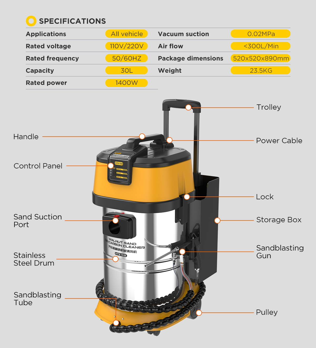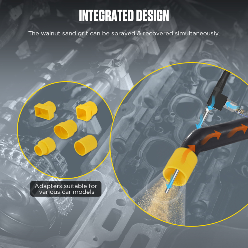 - External Air Source Design: The walnut blaster is powered by a robust 1400W high-performance motor, which uses an external air source to provide continuous power. This enhances the impact force of the walnut shell abrasive, ensuring thorough removal of carbon deposits from the engine pipes.