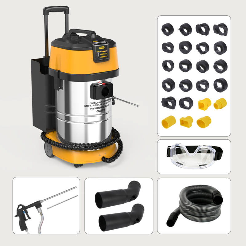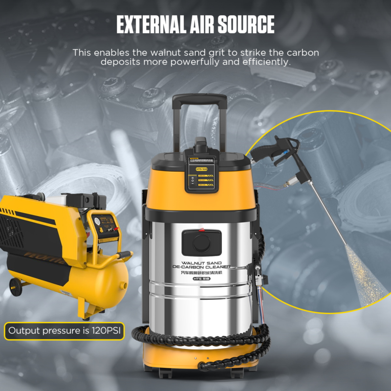 External Air Source Design: The walnut blaster has a powerful 1400W motor and uses an external air source for continuous power. This enhances the impact force of the walnut shell abrasive, ensuring thorough removal of carbon deposits from the engine pipes.