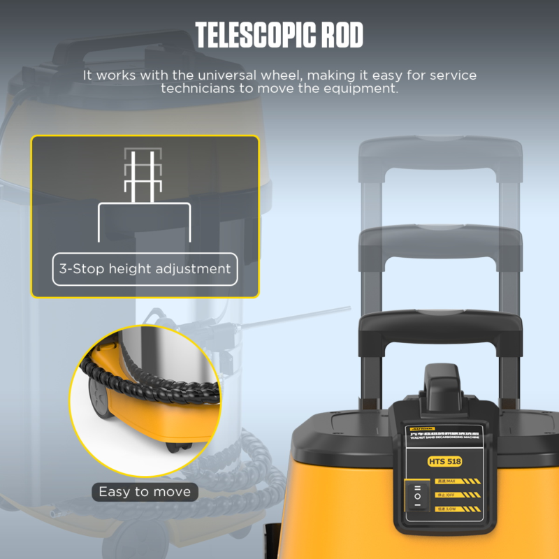 User-Friendly: The rear storage box is designed to store adapters, and the telescopic rod offers three adjustable height levels. Equipped with swivel casters, the unit can rotate 360°, allowing technicians to easily move the equipment during maintenance.