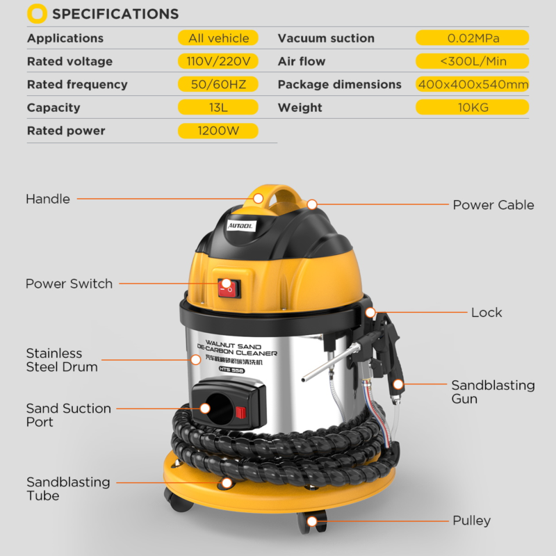 AUTOOL HTS558 walnut blaster features a 1200W motor that provides strong suction power, using physically harmless walnut shells for cleaning. It separates carbon deposits from the walnut shells through a filter, ensuring the shells are reusable. An external air compressor provides powerful sandblasting effects, effectively cleaning the intake manifold and valves, and helping the engine restore optimal performance.