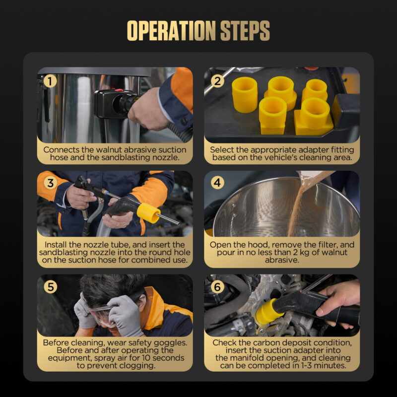 • Thoroughly Removing Carbon Deposits: The sandblasting method is used to clean the engine’s intake manifold and valves, effectively removing carbon deposits without disassembly, without damaging the engine.
