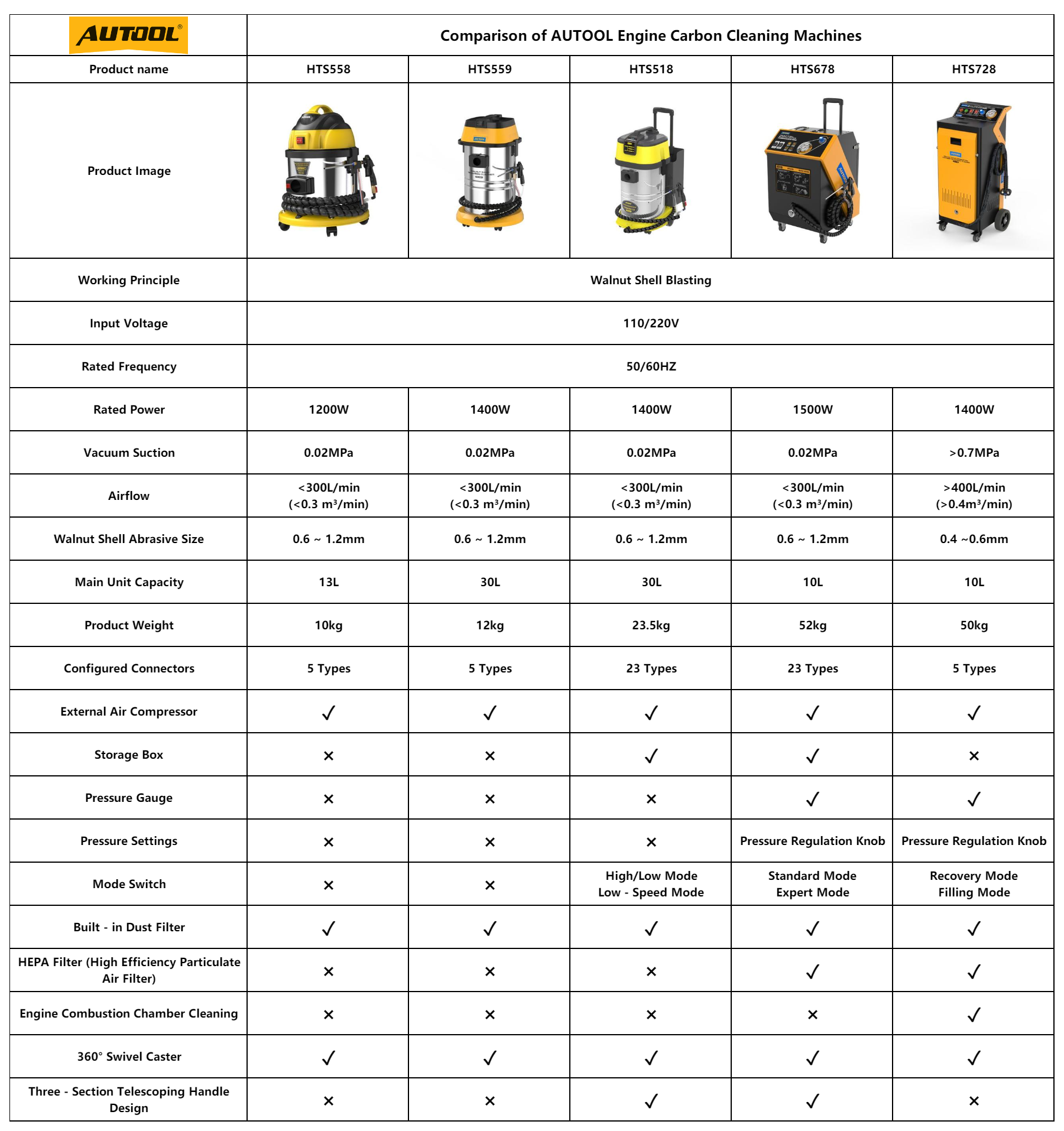 In contrast, the AUTOOL HTS728 Walnut Shell Sand Blaster is an upgraded version of the HTS678. This model utilizes finer walnut shell abrasive (0.4–0.6mm), making it ideal for more precise engine cleaning tasks. The most significant difference is that the AUTOOL HTS728 supports engine combustion chamber cleaning.