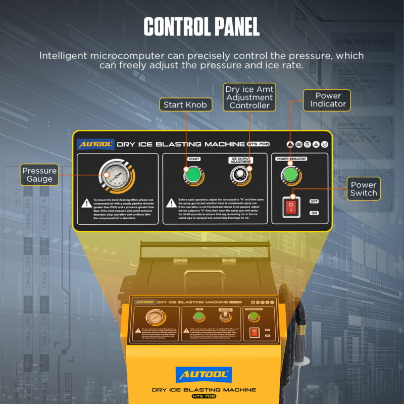 - Control Panel: AUTOOL HTS708 dry ice cleaning machine built with an Intelligent microcomputer can precisely control the pressure, which can freely adjust the pressure and speed.