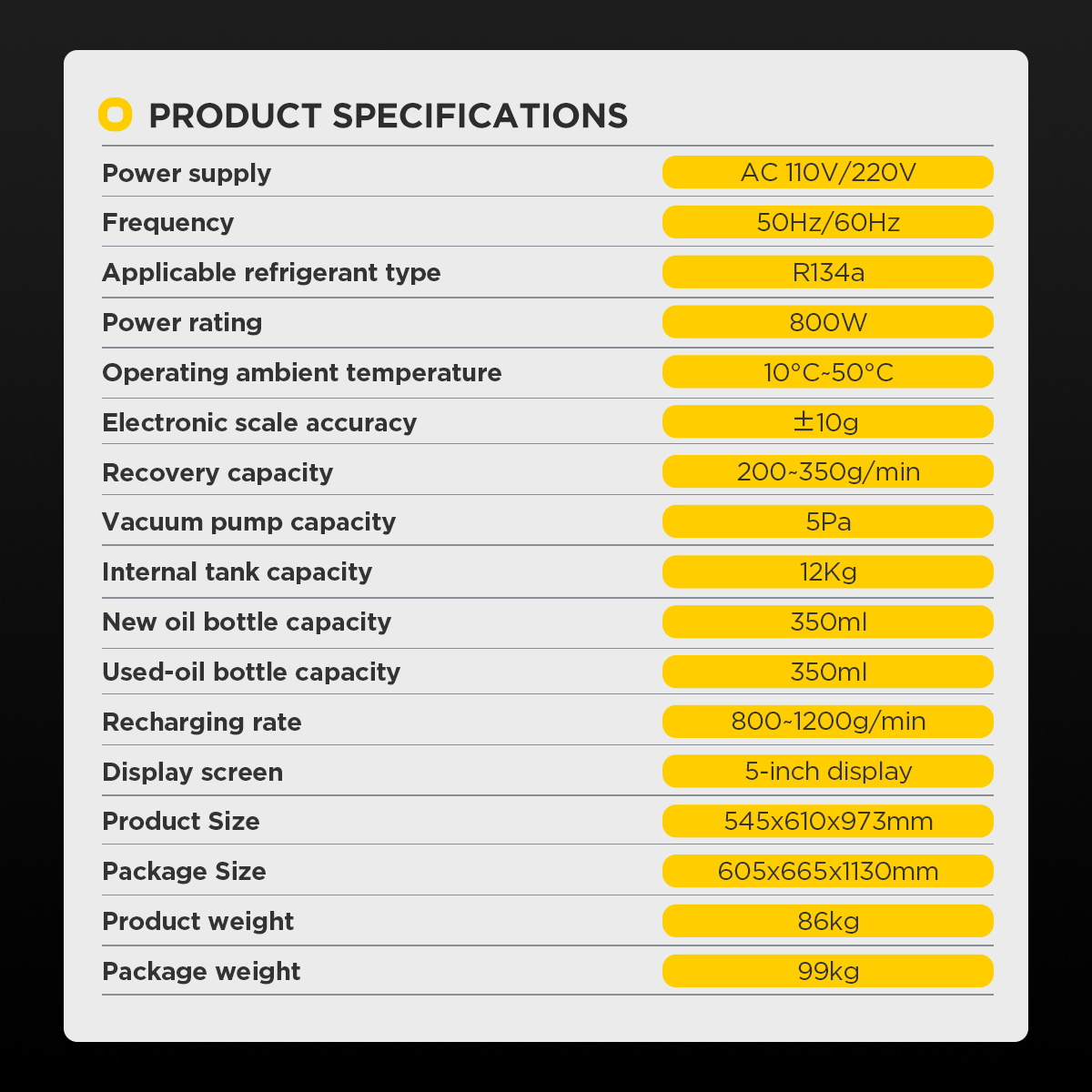 - Large-capacity built-in tank: can store up to 12 kilograms of refrigerant, supporting continuous replacement of refrigerant for multiple vehicles