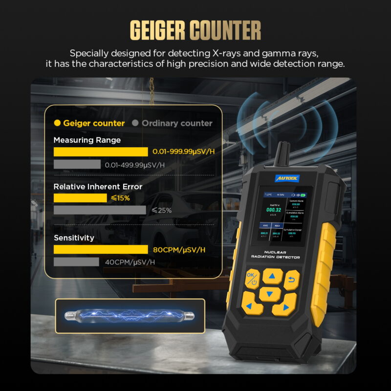 AUTOOL ND300 Nuclear Radiation Detector is a multi-functional nuclear radiation detector for industrial nuclear radiation, medical nuclear radiation, nuclear wastewater radiation and X-ray/gamma-ray applications. Equipped with a 2.1-inch screen display, it uses GEIGER counters specialized in detecting X-rays and γ-rays with high accuracy and wide detection range.