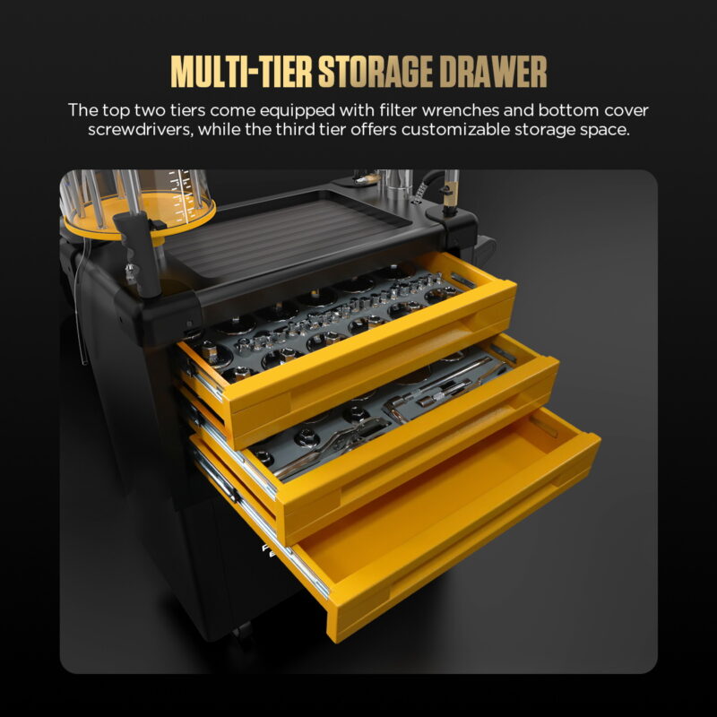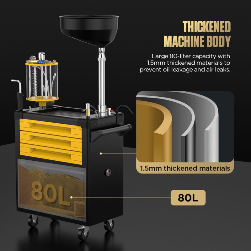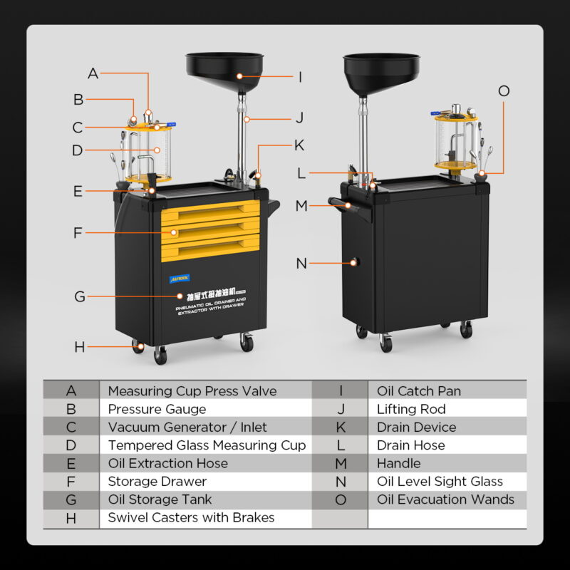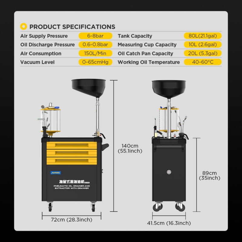 AUTOOL OD760 Engine Oil Extractor With pneumatic ultimate maintenance solution. Withstand extreme conditions, extract oil effortlessly with 5 suction tubes, and enjoy a spacious oil collection with a 20L tray.