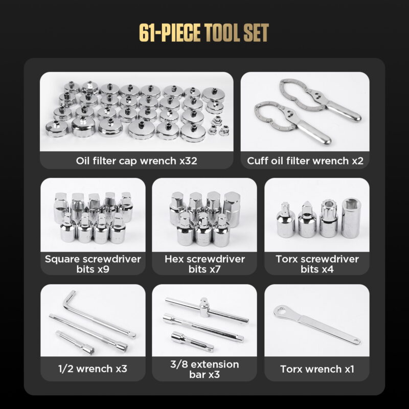 - Comprehensive 61-Piece Tool Set: Includes filter wrenches, bottom covers, and screwdrivers, covering a wide range of maintenance needs.