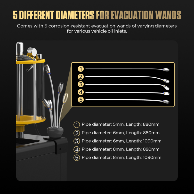 - Five Vacuum Suction Tubes: These are compatible with various vehicle models and offer versatility in oil extraction.