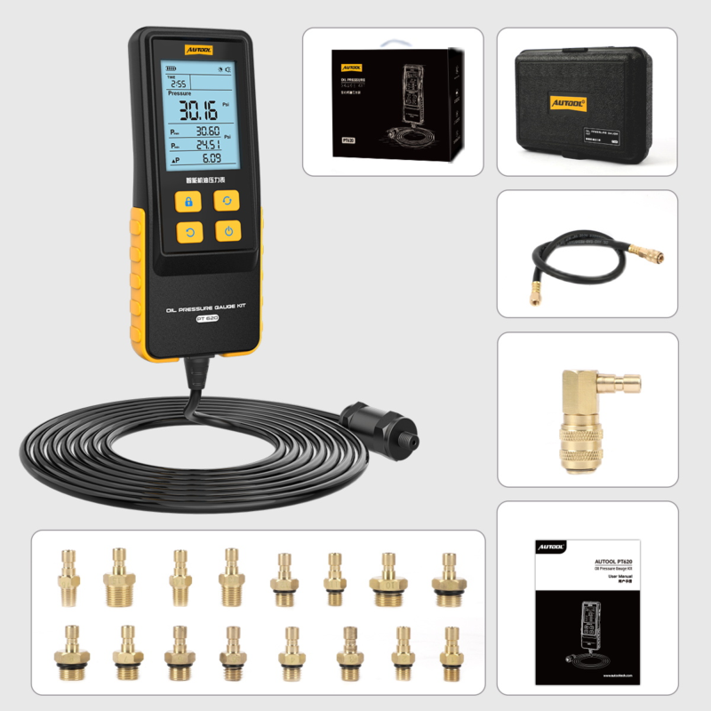 AUTOOL PT620 Engine oil pressure gauge is one of the latest automotive intelligent pressure detection series products launched by Accidental Technology, which is mainly used to detect the oil pressure of the engine, using a digital measurement system, and the detection sensitivity is extremely high. The ability to display the oil pressure in real-time and intuitively makes oil pressure detection easy and smooth.