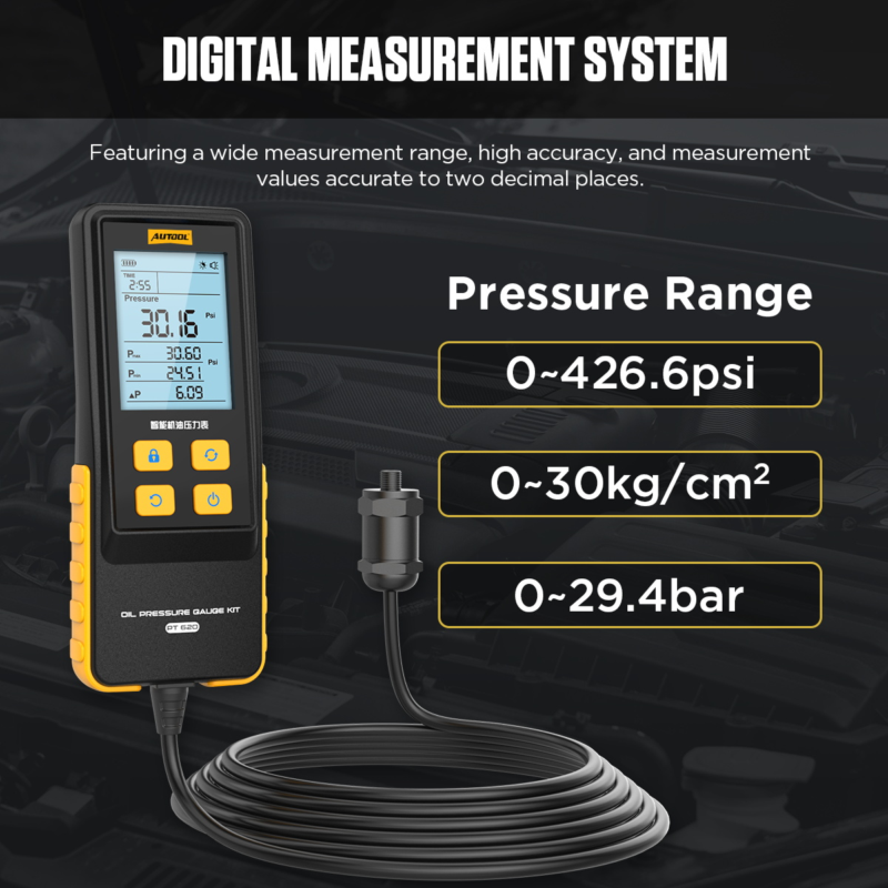 - High measurement accuracy: it can clearly and accurately display the data of real-time pressure, average pressure, and engine oil temperature.
