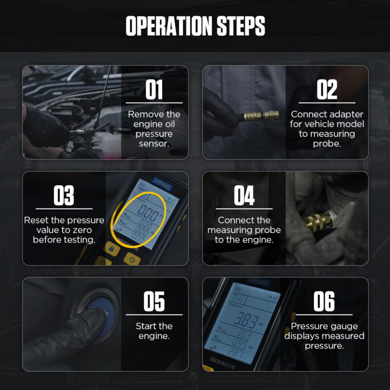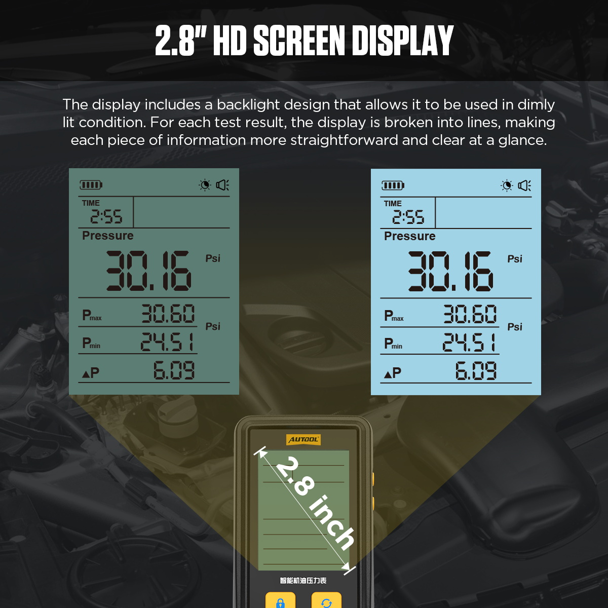 - Intelligent digital pressure gauge: 2.8-inch backlit display shows clear and accurate data. The digital pressure gauge has a display resolution of 0.01. It can measure the real-time pressure value, average pressure value, and temperature of engine oil, as well as the measurement time.
