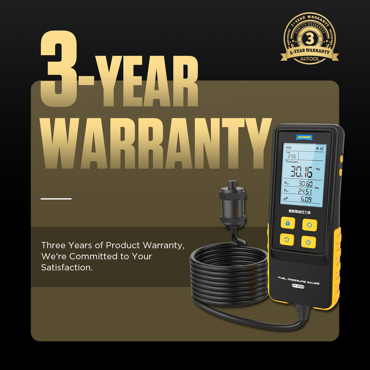 AUTOOL PT630 Fuel Pressure Gauge made of high-end corrosion-resistant material, designed for gasoline engine systems. Compared with traditional pressure gauges, PT630 has been digitally upgraded to provide more accurate measurements, three-unit switching, and easy saving of test data, which can be easily done by one person, making it the right choice for you.