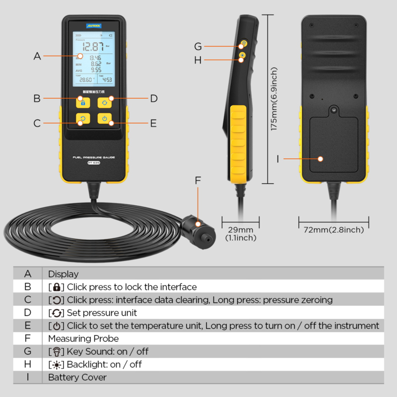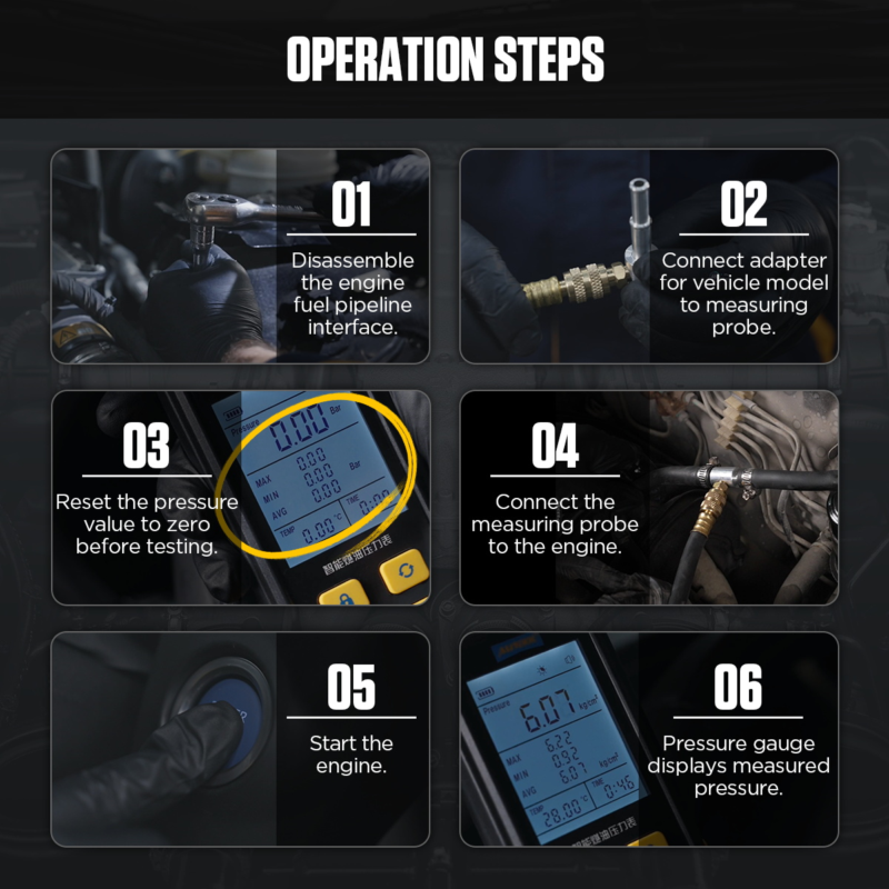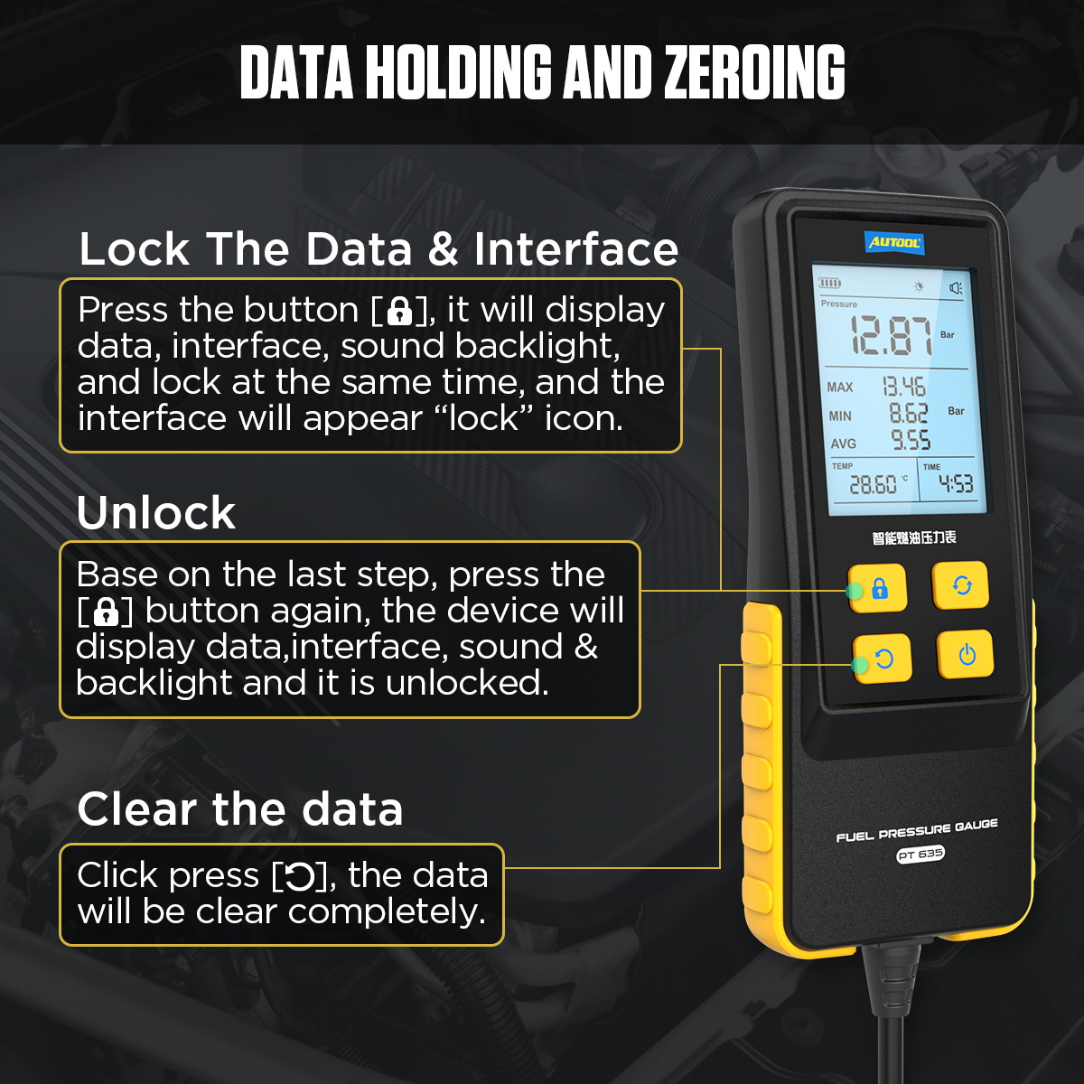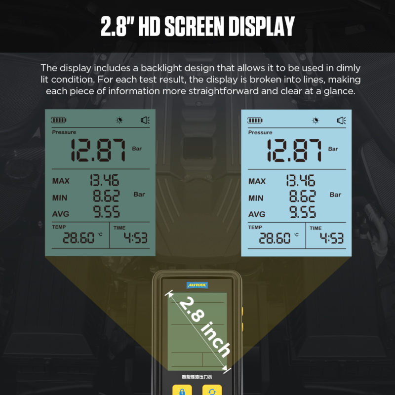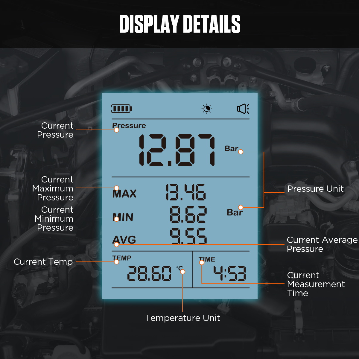 - Smart Digital Pressure Gauge: 2.8-inch backlit display shows clear and accurate data. The digital pressure gauge has a display resolution of 0.01. It measures real-time pressure, average pressure, fuel oil temperature, and measurement time.