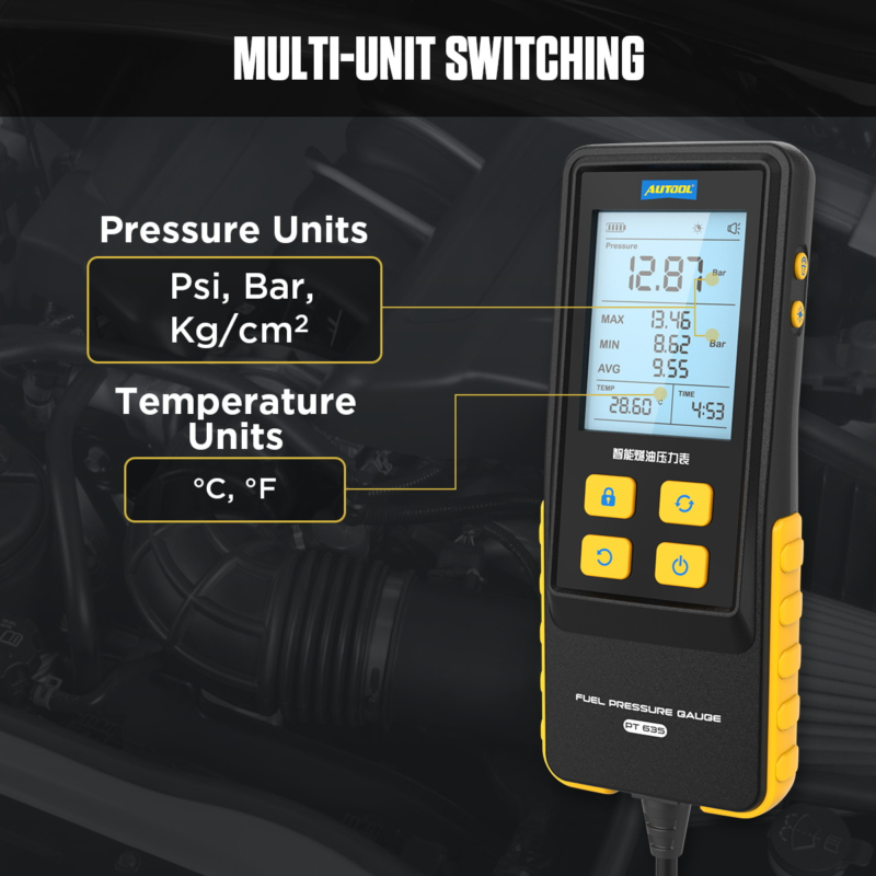 AUTOOL PT635 Fuel Pressure Gauge is a professional tool for measuring and monitoring actual pressure and temperature in automotive engine fuel systems. Compared to the PT630, the PT635 is an upgrade to the automotive fuel pressure gauge, and its performance is also excellent, but the functions are more complete. In addition to also measuring engine fuel pressure, the PT635 also supports the simultaneous measurement of fuel temperature. This upgrade allows users to better monitor and grasp changes in fuel temperature in the fuel system, effectively preventing fuel from operating at unsuitable temperatures, and thereby optimizing the combustion process.