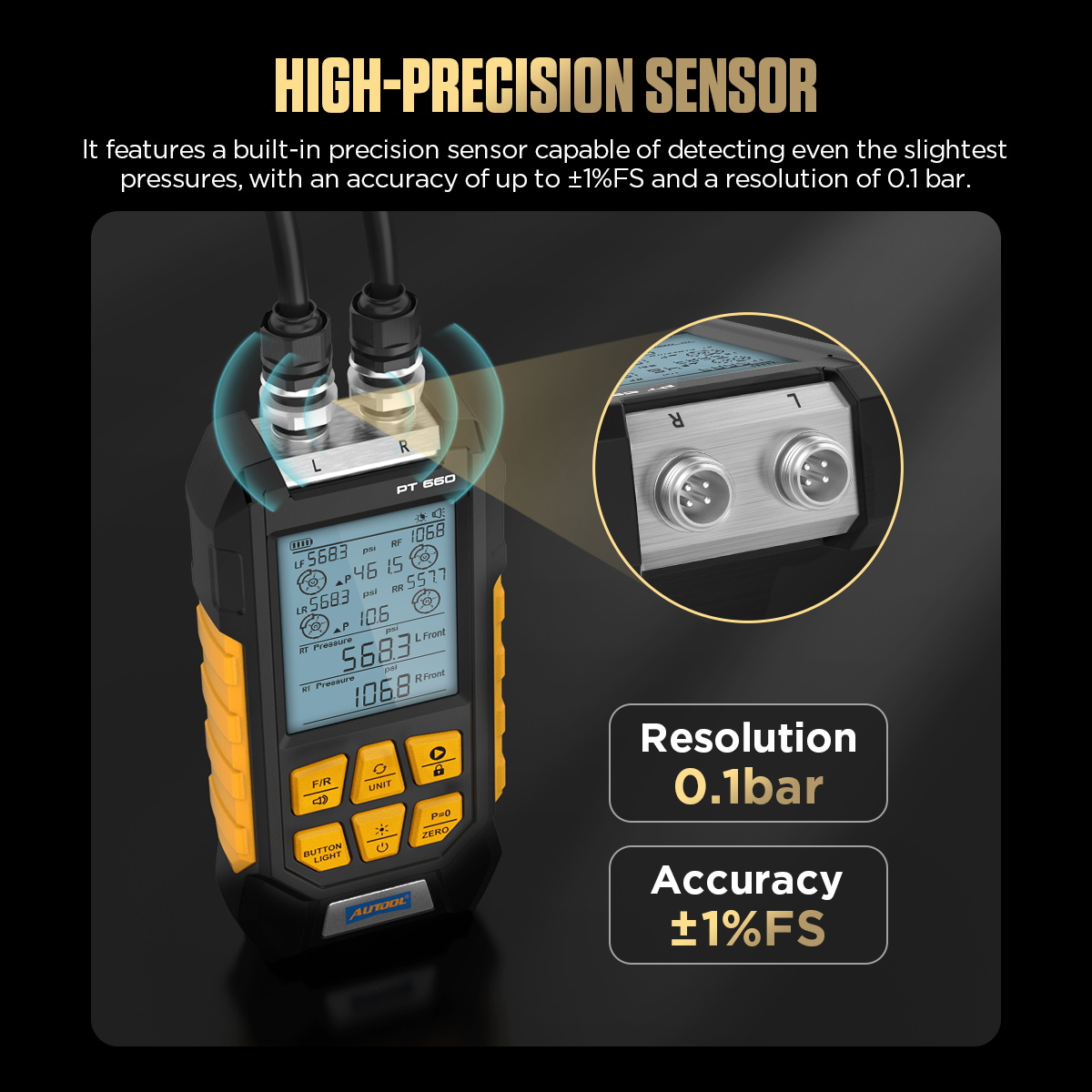 The AUTOOL PT660 Brake Pressure Gauge for brake system checking supports two-channel testing by means of a high-precision sensor and atmospheric pressure calibrator. One-touch locking and comparison of data at any time. Make your work more efficient and smarter.
