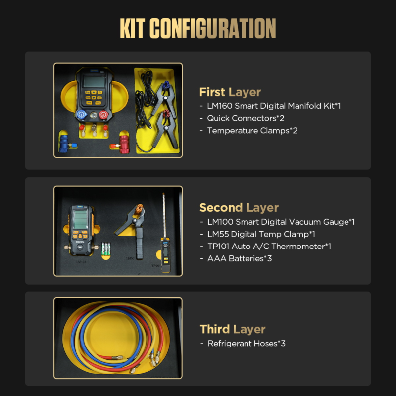 - Refrigerant Test Kit: Equipped with the AUTOOL LM55, LM100, LM160, and TP101 test instruments, it’s suitable for a variety of scenarios and needs, helping users quickly perform vehicle refrigerant testing and maintenance.