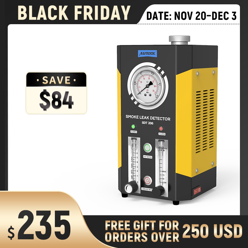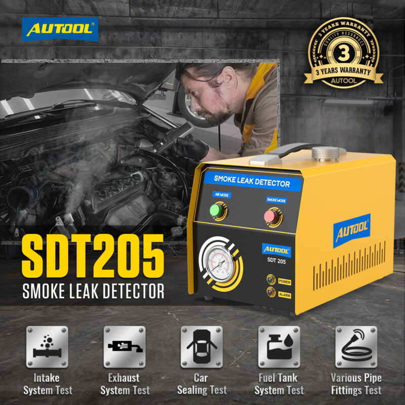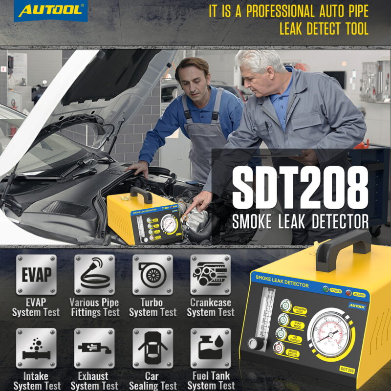 The AUTOOL smoke leak detector series includes SDT101 and SDT103 for EVAP systems (3.2Kpa), SDT106 and SDT202 for beginners (12 psi), and SDT203, SDT205, SDT205S, SDT206, and SDTMASTER as standard and high-end models (15 psi).SDT208 supports up to 35Psi.