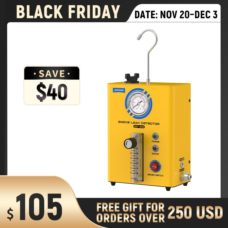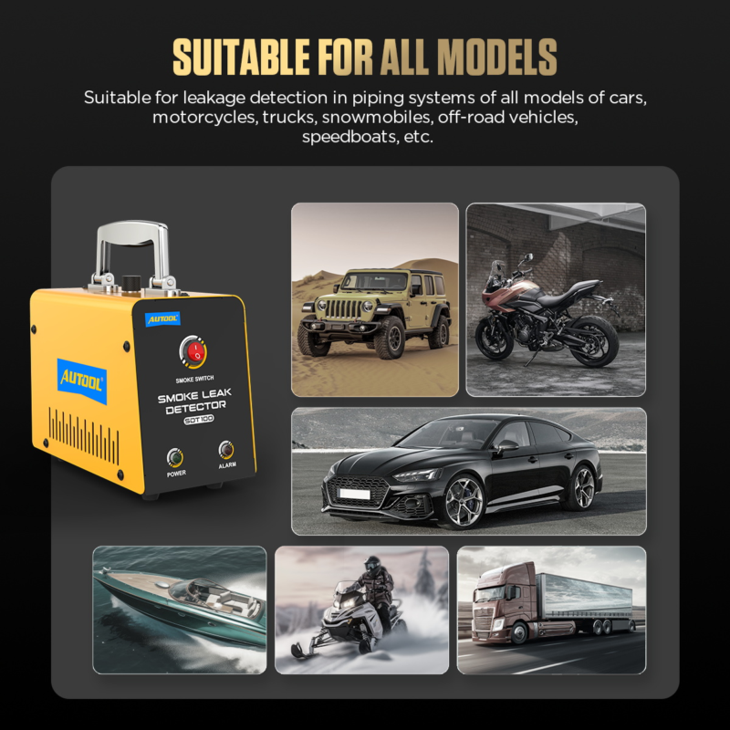 The AUTOOL SDT100 smoke tester is a professional tool for quickly detecting vacuum, gas, and oil leaks. Compact and lightweight with a built-in air pump, it is compatible with all cars, motorcycles, ATVs, snowmobiles, off-road vehicles, light trucks, and even speedboats. Ideal for both professional technicians and automotive enthusiasts, it delivers reliable diagnostics for faster, easier maintenance.