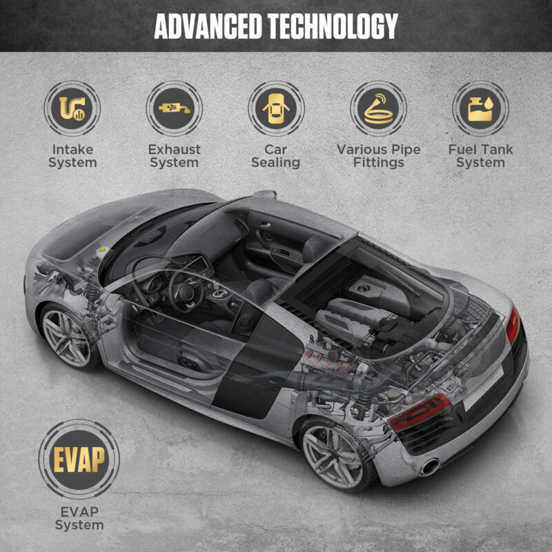 AUTOOL SDT101 EVAP smoke machine delivers the standard 32-bar test pressure required for automotive EVAP systems by precisely regulating the pressure from an external air source. It can quickly output smoke in less than ten seconds, greatly improving your work efficiency. It is one of the necessary maintenance and inspection tools in your workshop.